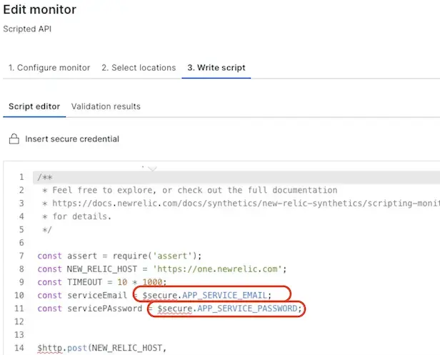 You can use secure credentials with synthetic monitoring to store critical information, such as passwords, API keys, usernames, etc. This prevents scripted monitor users from viewing, updating, or deleting these values unless they have explicit permissions in New Relic.